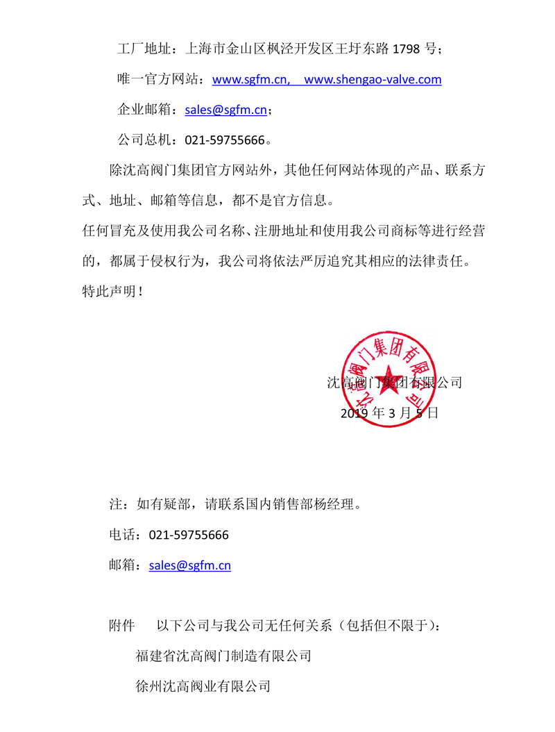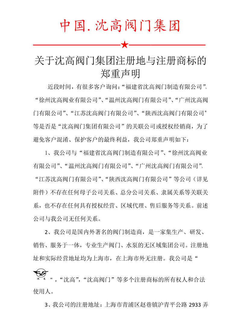 關(guān)于沈高閥門集團(tuán)注冊地與注冊商標(biāo)的鄭重聲明