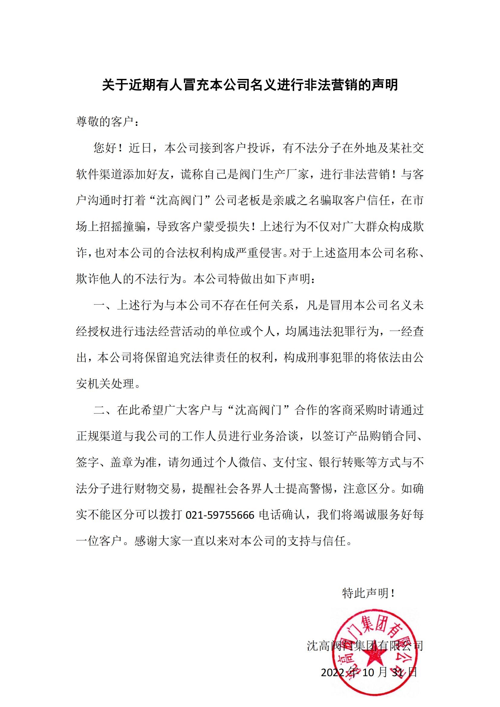 關(guān)于近期有人冒充本公司名義進行非法營銷的聲明